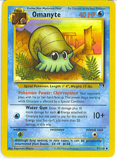 [W] Water Gun (10+) Does 10 damage plus 10 more damage for each W Energy attached to Omanyte but not used to pay for this attack's Energy cost. You can't add more than 20 damage in this way.