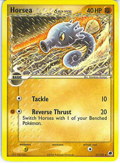 Type | Fighting | Pokemon serie | Dragon Frontiers | Stadie | Basic | HP | 40 | Sjældenhed | Uncommon | Tilbagetrækning | 1 | Svaghed | L | Kortnummer | 31 | Evne | [C] Tackle (10) [CF] Reverse Thrust (20) Switch Horsea with 1 of your Benched Pokemon.