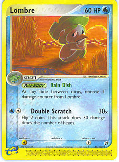 Type | Water | Pokemon serie | Sandstorm | Stadie | Stage 1 | HP | 60 | Sjældenhed | Uncommon | Tilbagetrækning | 1 | Svaghed | L | Kortnummer | 45 | Evne | [CW] Double Scratch (30x) Flip 2 coins. This attack does 30 damage times the number of heads.