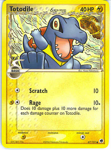 Type | Lightning | Pokemon serie | Dragon Frontiers | Stadie | Basic | HP | 40 | Sjældenhed | Common | Tilbagetrækning | 1 | Svaghed | L | Kortnummer | 67 | Evne | [C] Scratch (10) [CL] Rage (10+) Does 10 damage plus 10 more damage for each damage counter on Totodile.