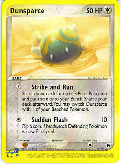 Type | Colorless | Pokemon serie | Sandstorm | Stadie | Basic | HP | 50 | Sjældenhed | Common | Tilbagetrækning | 1 | Svaghed | F | Kortnummer | 60 | Evne | [C] Strike and Run - Search your deck for up to 3 Basic Pokemon and put them onto your Bench. Shuffle your deck afterward. You may switch Dunsparce with 1 of your Benched Pokemon. [C] Sudden Flash (10) Flip a coin. If heads, each Defending Pokemon is now Paralyzed.