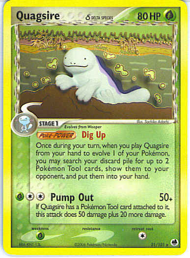 Type | Grass | Pokemon serie | Dragon Frontiers | Stadie | Stage 1 | HP | 80 | Sjældenhed | Rare | Tilbagetrækning | 1 | Svaghed | G | Kortnummer | 21 | Evne | [CCG] Pump Out (50+) If Quagsire has a Pokemon Tool attached to it, this attack does 50 damage plus 20 more damage.