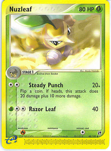 Type | Grass | Pokemon serie | Sandstorm | Stadie | Stage 1 | HP | 80 | Sjældenhed | Uncommon | Tilbagetrækning | 1 | Svaghed | R | Kortnummer | 48 | Evne | [CC] Steady Punch (20) Flip a coin. If heads, this attack does 20 damage plus 10 more damage. [CCG] Razor Leaf (40)