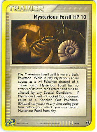 Play Mysterious Fossil as if it were a Basic Pokemon. While in play, Mysterious Fossil counts as a C Pokemon (instead of a Trainer card). Mysterious Fossil has no attacks of it's own, can't retreat, and can't be affected by any Special Conditions. If Mysterious Fossil is Knocked Out, it doesn't count as a Knocked Out Pokemon. (Discard it anyway.) At any time during your turn before your attack, you may discard Mysterious Fossil from play.