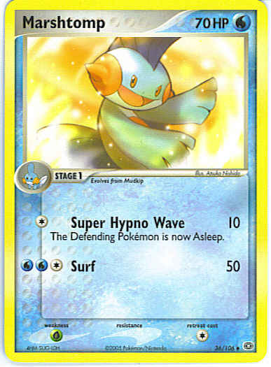 Type | Water | Pokemon serie | Emerald | Stadie | Stage 1 | HP | 70 | Sjældenhed | Uncommon | Tilbagetrækning | 1 | Svaghed | G | Kortnummer | 36 | Evne | [C] Super Hypno Wave (10) The Defending Pokemon is now Asleep. [CWW] Surf (50) | Evne2 | [C] Super Hypno Wave (10) The Defending Pokemon is now Asleep. [CWW] Surf (50) | Kunstner | Atsuko Nishida |