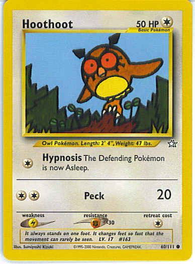 Type | Colorless | Pokemon serie | Neo Genesis | Stadie | Basic | HP | 50 | Sjældenhed | Common | Tilbagetrækning | 1 | Modstand | F | Svaghed | L | Kortnummer | 60 | Evne |