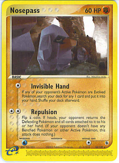 Type | Fighting | Pokemon serie | Ruby Sapphire | Stadie | Basic | HP | 60 | Sjældenhed | Rare | Tilbagetrækning | 1 | Svaghed | W | Kortnummer | 18 | Evne | [C] Invisible Hand - If any of your opponent's Active Pokemon are Evolved Pokemon, search your deck for any 1 card and put it into your hand. Shuffle your deck afterward. [CC] Repulsion - Flip a coin. If heads, your opponent returns the Defending Pokemon and all cards attached to it in his or her hand. (If your opponent doesn't have any Benched Pokemon or other Active Pokemon, this attack does nothing.)