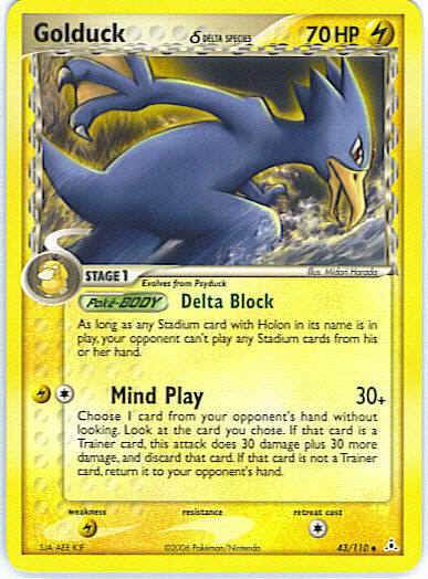 Type | Lightning | Pokemon serie | Holon Phantoms | Stadie | Stage 1 | HP | 70 | Sjældenhed | Uncommon | Tilbagetrækning | 1 | Svaghed | L | Kortnummer | 43 | Evne | [CL] Mind Play (30+) Choose 1 card from your opponent's hand without looking. Look at the card you chose. If that card is a Trainer card, this attack does 30 damage plus 30 more damage, and discard that card. If that card is not a Trainer card, return it | Evne2 | [CL] Mind Play (30+) Choose 1 card from your opponent's hand without looking. Look at the card you chose. If that card is a Trainer card, this attack does 30 damage plus 30 more damage, and discard that card. If that card is not a Trainer card, return it | Kunstner | Tomokazu Komiya |