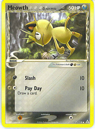 Type | Darkness | Pokemon serie | Holon Phantoms | Stadie | Basic | HP | 50 | Sjældenhed | Common | Tilbagetrækning | 1 | Svaghed | F | Kortnummer | 71 | Evne | [D] Slash (10) [CM] Pay Day (10) Draw a card. | Evne2 | [D] Slash (10) [CM] Pay Day (10) Draw a card. | Kunstner | Aya Kusube |