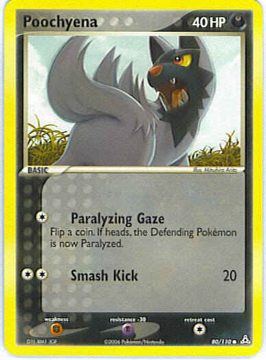 Type | Darkness | Pokemon serie | Holon Phantoms | Stadie | Basic | HP | 40 | Sjældenhed | Common | Tilbagetrækning | 1 | Modstand | P | Svaghed | F | Kortnummer | 80 | Evne | [C] Paralyzing Gaze - Flip a coin. If heads, the Defending Pokemon is now Paralyzed. [CC] Smash Kick (20) | Evne2 | [C] Paralyzing Gaze - Flip a coin. If heads, the Defending Pokemon is now Paralyzed. [CC] Smash Kick (20) | Kunstner | Sachiko Adachi |