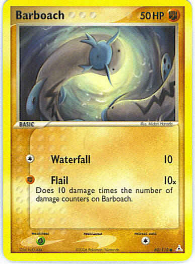 Type | Fighting | Pokemon serie | Holon Phantoms | Stadie | Basic | HP | 50 | Sjældenhed | Common | Tilbagetrækning | 1 | Svaghed | G | Kortnummer | 60 | Evne | [C] Waterfall (10) [F] Flail (10x) Does 10 damage times the number of damage counters on Barboach. | Evne2 | [C] Waterfall (10) [F] Flail (10x) Does 10 damage times the number of damage counters on Barboach. | Kunstner | Tomokazu Komiya |