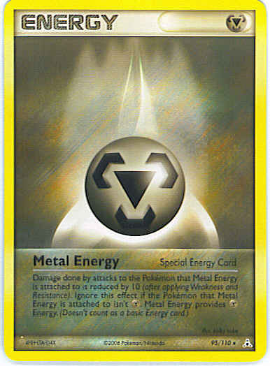 Damage done by attacks to the Pokemon that Metal Energy is attached to is reduced by 10 (after applying Weakness and Resistance). Ignore this effect if the Pokemon that Metal Energy is attached to isn't M. Metal Energy provides M Energy. (Doesn't count as