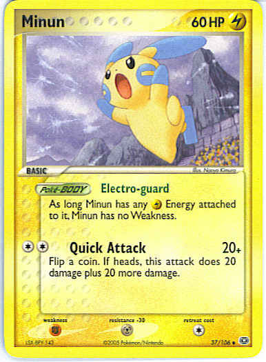 Type | Lightning | Pokemon serie | Emerald | Stadie | Basic | HP | 60 | Sjældenhed | Uncommon | Tilbagetrækning | 1 | Modstand | M | Svaghed | F | Kortnummer | 37 | Evne | [CC] Quick Attack (20+) Flip a coin. If heads, this attack does 20 damage plus 20 more damage. | Evne2 | [CC] Quick Attack (20+) Flip a coin. If heads, this attack does 20 damage plus 20 more damage. | Kunstner | Naoyo Kimura |