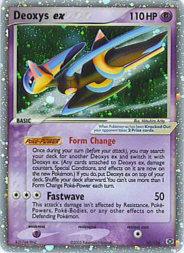 Type | Psychic | Pokemon serie | Emerald | Stadie | Basic | HP | 110 | Sjældenhed | Ultra-Rare | Tilbagetrækning | 1 | Svaghed | P | Kortnummer | 93 | Evne | on it are now on the new Pokemon.) If you do, put Deoxys ex on top of your deck. Shuffle your deck afterward. You can't use more than 1 Form Change Poke-Power each turn. (Poke-POWER)