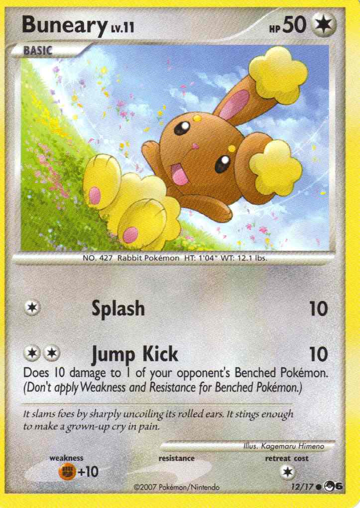 Type | Colorless | Pokemon serie | OP Series 6 | Stadie | Basic | HP | 50 | Sjældenhed | Common | Tilbagetrækning | 1 | Svaghed | F+10 | Kortnummer | 12 | Evne | [C] Splash (10) [CC] Jump Kick (10) Does 10 damage to 1 of your opponent's Benched Pokemon. (Don't apply Weakness and Resistance for Benched Pokemon.)